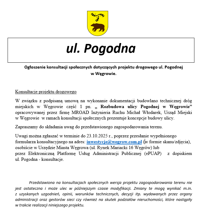 Ogłoszenie konsultacji społecznych dotyczących projektu drogowego ul. Pogodnej w WęgrowieArchiwum
