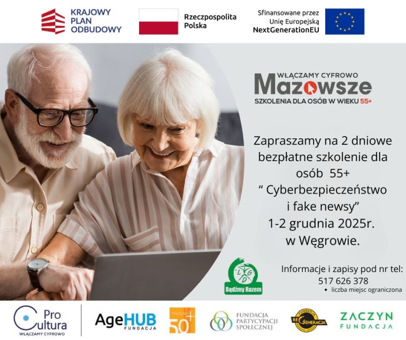 Stowarzyszenie - LGD "Bądźmy Razem" wraz z Fundacją PRO Cultura zaprasza na bezpłatne szkolenie pt. "Cyberbezpieczeństwo i fake newsy" 1-2 grudnia 2025 r. w godz: 9.00 -16.00 w sali konferencyjnej Poradni Psychologiczno-Pedagogicznej przy ul. Piłsudskiego 23 w Węgrowie. Na szkolenie obowiązują wcześniejsze zapisy.