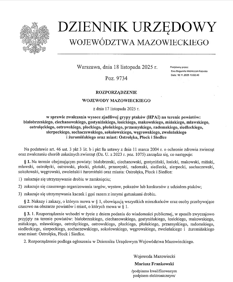 Rozporządzenie Wojewody Mazowieckiego dot. zwalczania wysoce zjadliwej grypy ptaków